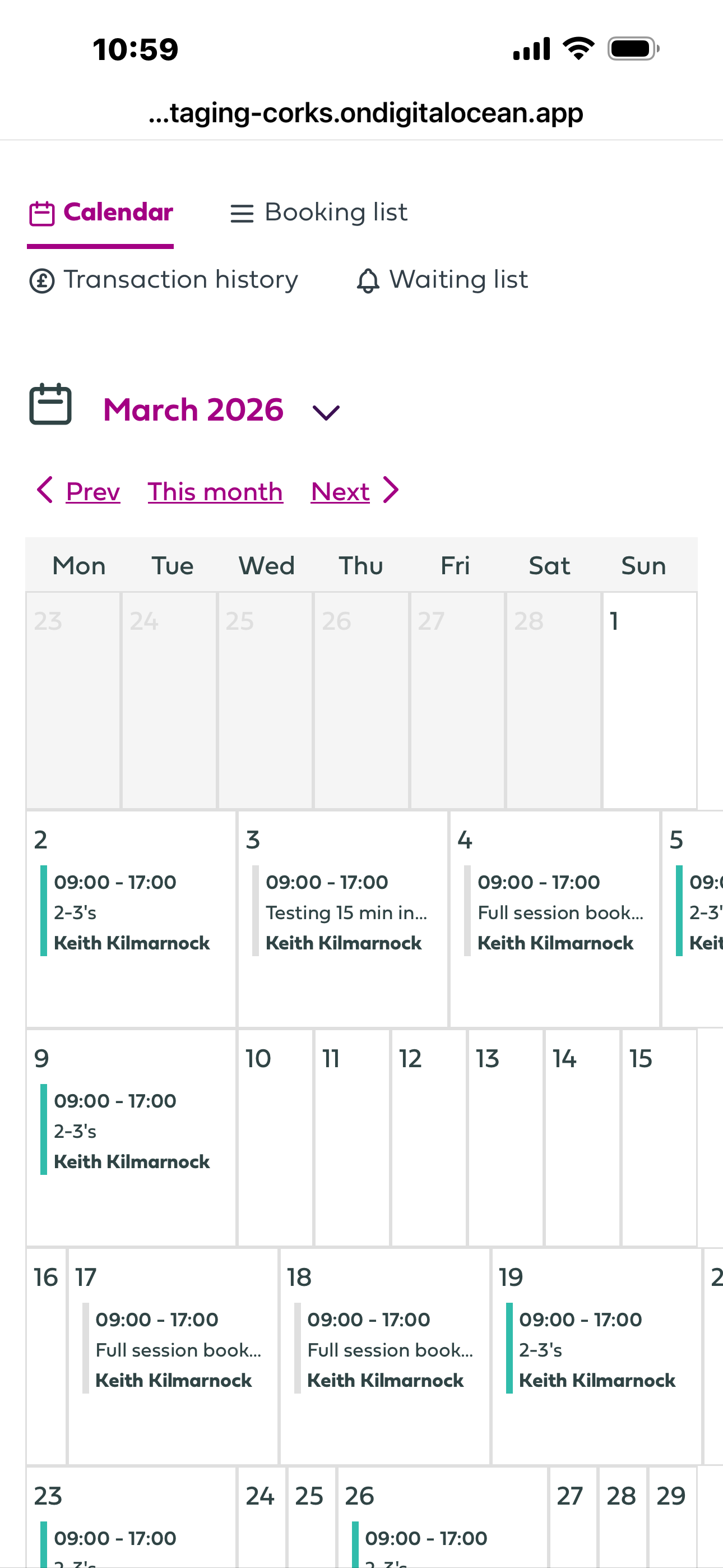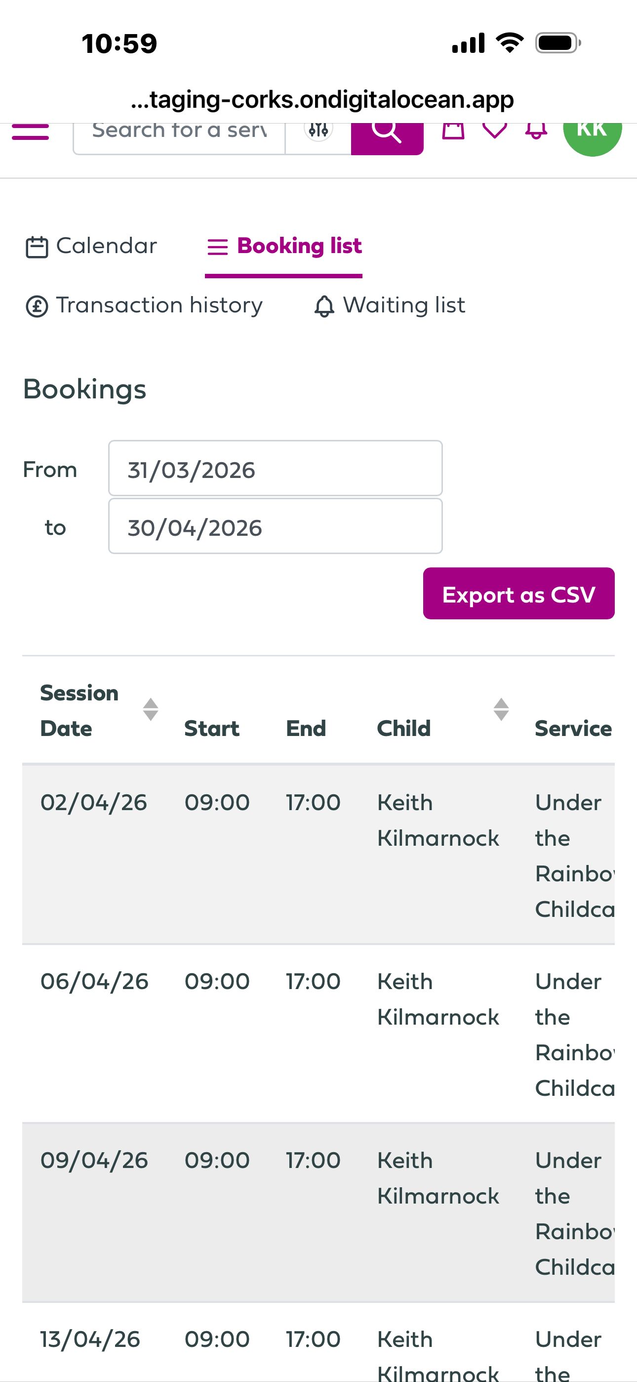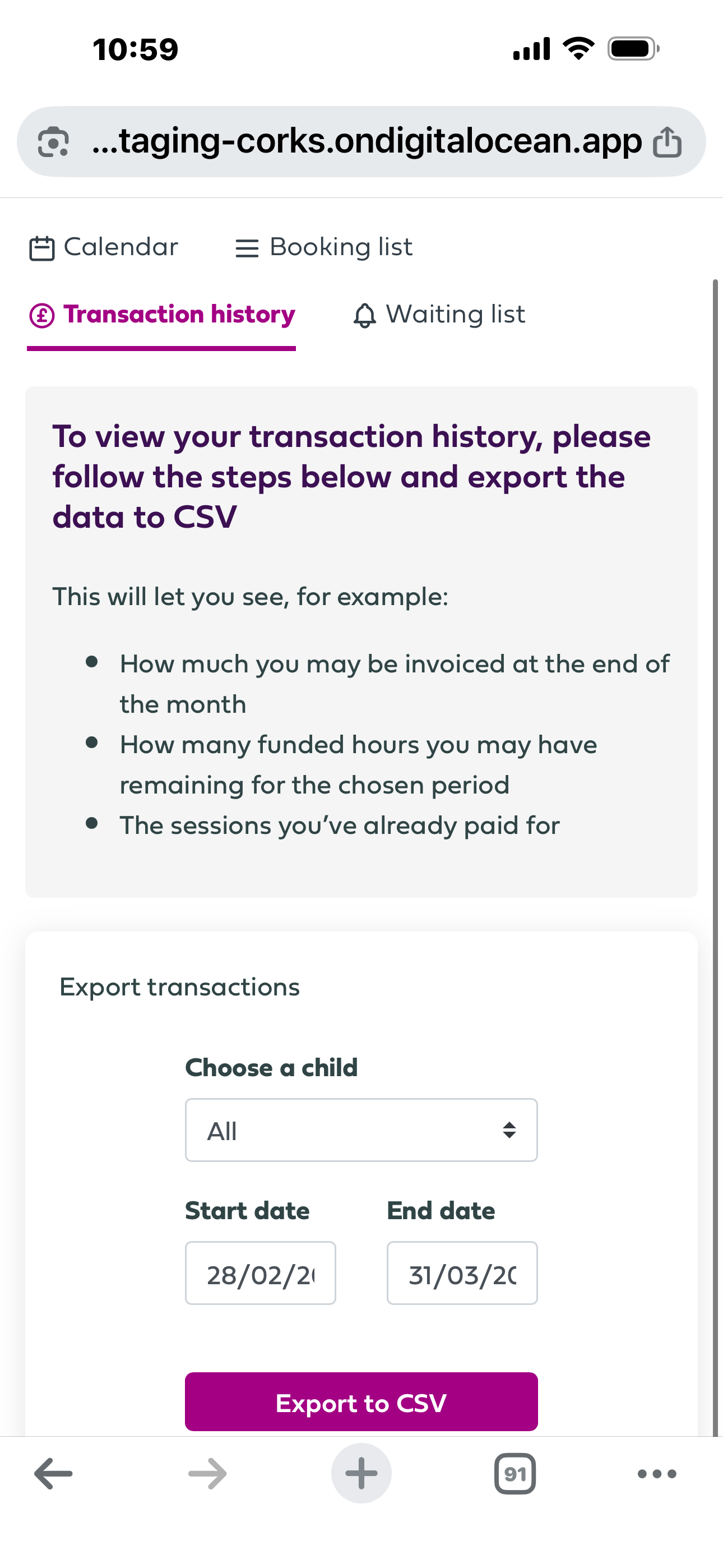 Calendar - where you can select a month and view all your childrens bookings for that month. You can also select a booking and cancel it from here