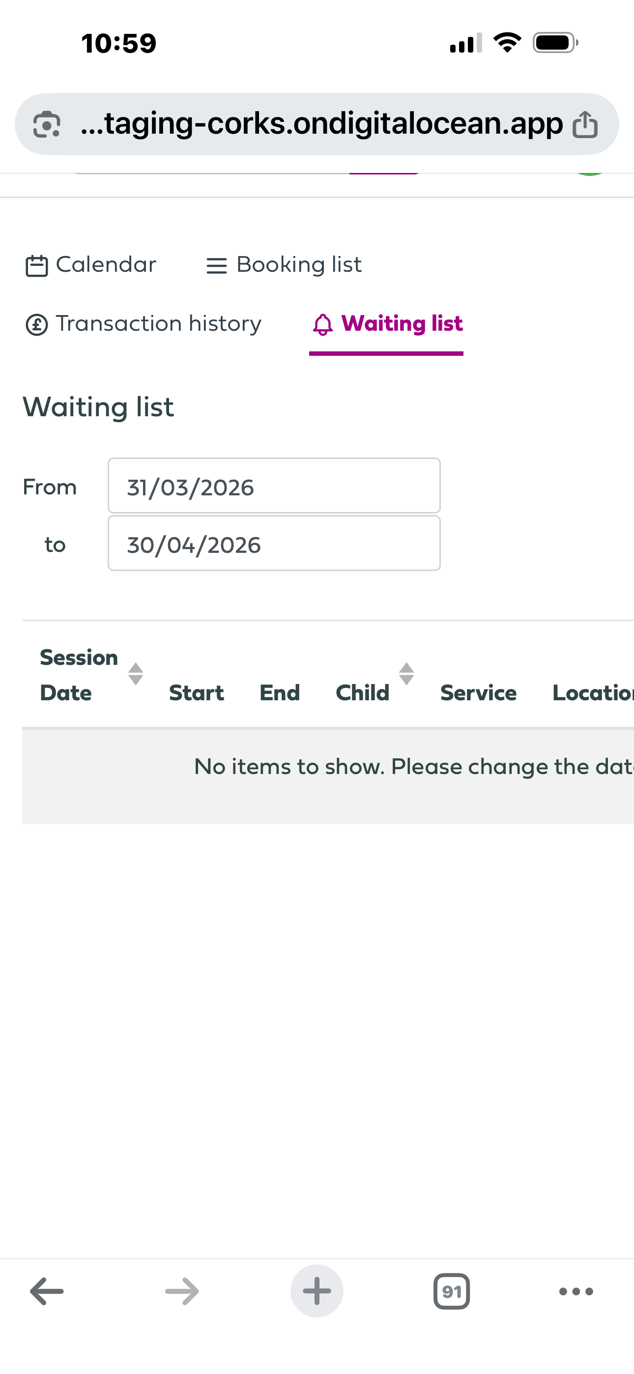 Waiting List - if you have tried to book a session that is full and have been given the option to be added to a waiting list (generally only if you are booking a full session) you will see these in here